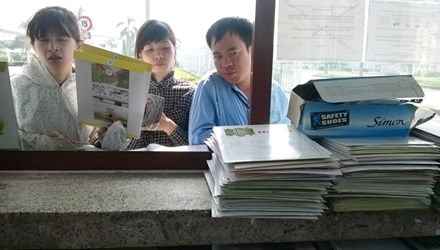 Phóng viên tiếp tục nộp hồ sơ vào công ty Samsung (Phổ Yên, Thái Nguyên), ngay lối vào công ty treo biển thông báo tuyển dụng dài gần 5m: “Tuyển công nhân tốt nghiệp trung học phổ thông”. Chúng tôi tới phòng tuyển dụng của công ty lúc 15h30, hai chồng hồ sơ dày hơn 40 cm đặt trên bàn, dãy ghế dành cho ứng viên không còn chỗ trống, nhiều người phải ngồi xuống sàn nhà. Cạnh tôi, chị Hà Thị Lệ (quê huyện Tân Sơn, Phú Thọ) tiết lộ, tốt nghiệp cử nhân lâm nghiệp (đại học Nông lâm Thái Nguyên) nhưng không tìm được việc nên mang bằng cấp ba đi xin làm công nhân.