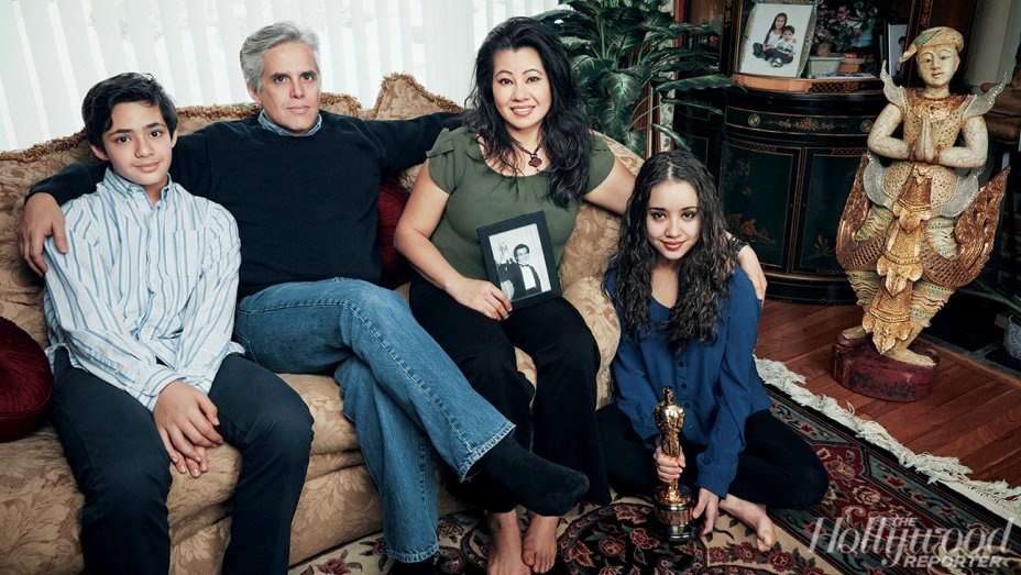 | Sophia Ngor Demetri nay hạnh phúc bên cạnh gia đình cùng chồng và hai người con. Trên tay cô là bức ảnh người chú quá cố nâng cao tượng vàng Oscar. Ảnh: The Hollywood Reporter |