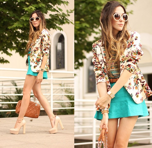 Trẻ trung xinh đẹp với blazer hoa và chân váy xanh bạc hà mát mắt.