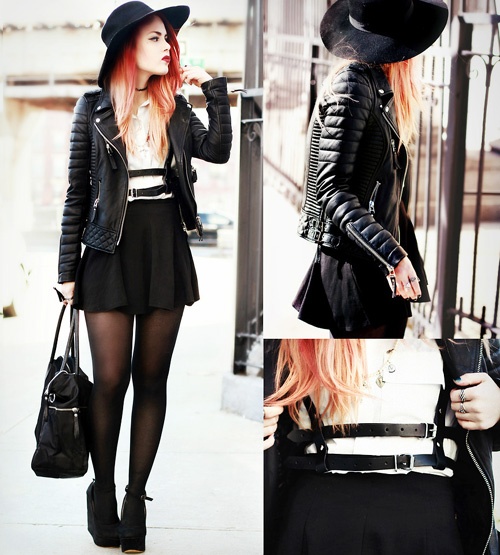 Gợi ý tiệc tùng cho cô nàng yêu thích váy xòe và áo da kiểu moto jacket.