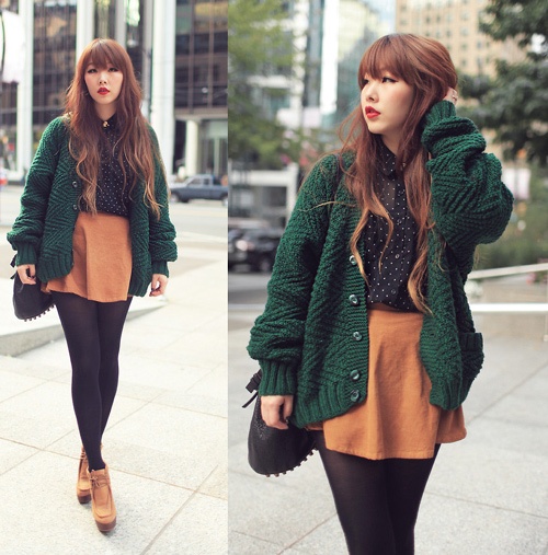 Trước đây thì các bạn gái thường mix váy xòe với các kiểu áo len cài cúc ôm sát, tuy nhiên, năm nay thì áo cardigan dáng thụng lại được nhiều người ưa thích hơn.