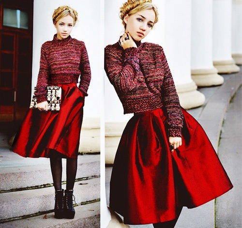 Bạn cũng có thể mix váy xòe cùng với áo len dáng thụng cũng rất đẹp mắt.
