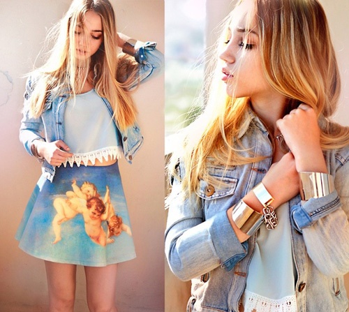 | Áo khoác denim sáng màu trở nên dịu dàng khi mix kèm váy ren trắng. |