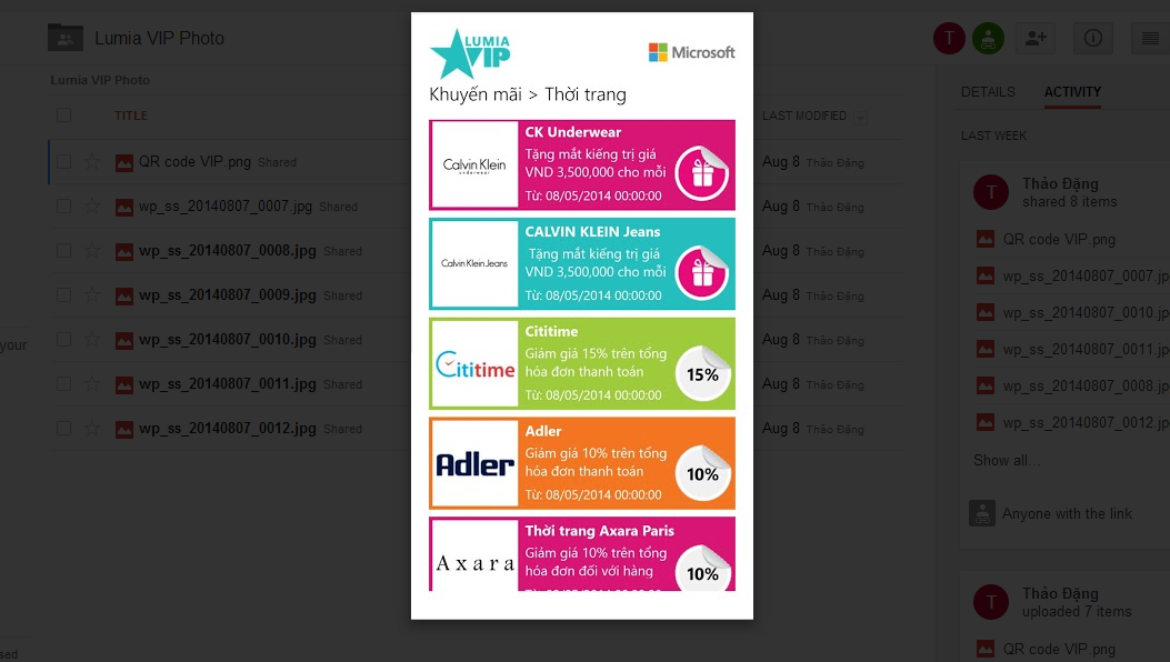 Lumia mang đến nhiều ưu đãi hơn cho các tín đồ thời trang với ứng dụng Lumia VIP. Khi có ứng dụng này, bạn sẽ nhận được những ưu đãi như giảm 25% tại GAP khi mua từ 3 sản phẩm trở lên từ 15-24/8, hay giảm 150.000 đồng cho bất kỳ đơn hàng nào từ 600.000 đồng kể từ hôm nay tại Lazada, ưu đãi 10% tại các cửa hàng của CK, Tommy hay Axara, MAC... Hoặc bạn cũng có thể thư giãn ở Her Spa and Lifestyle sau một ngày mua sắm rã rời đôi chân. Bạn sẽ được hưởng ưu đãi cho các vụ chăm sóc da và những phần quà tuyệt vời khác. Sau đó bạn sẽ kết thúc ngày shopping với ẩm thực Nhật Bản tại Tenshi Sushi Bar, ưu đãi 20%.