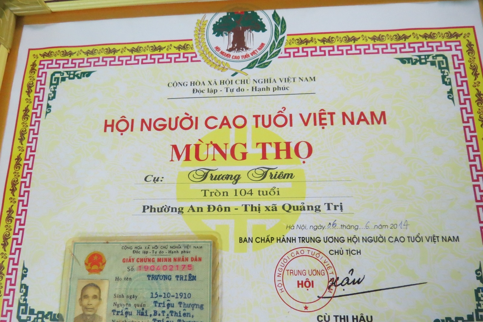 | Giấy mừng thọ và chứng minh nhân dân của hai cụ. |