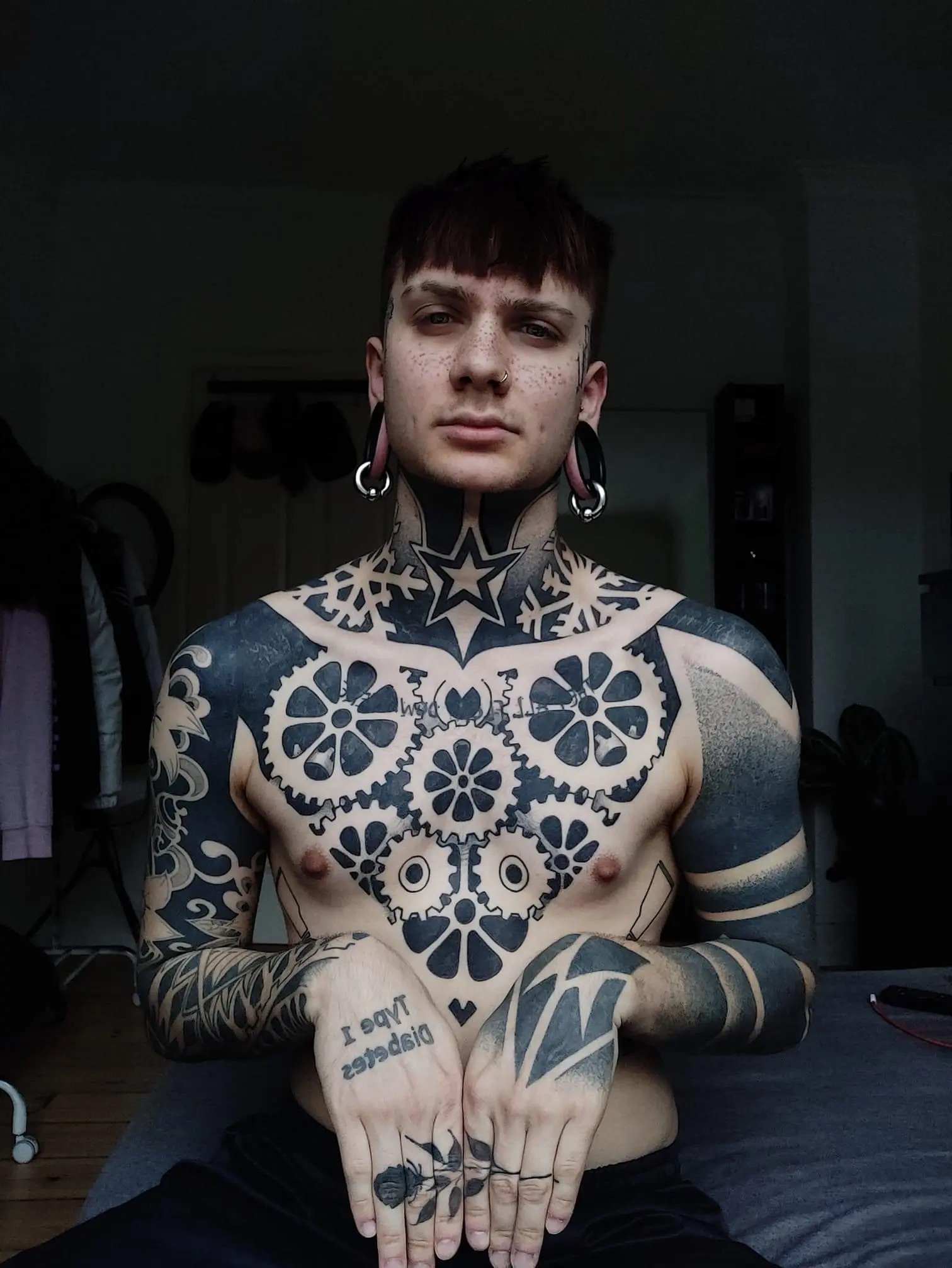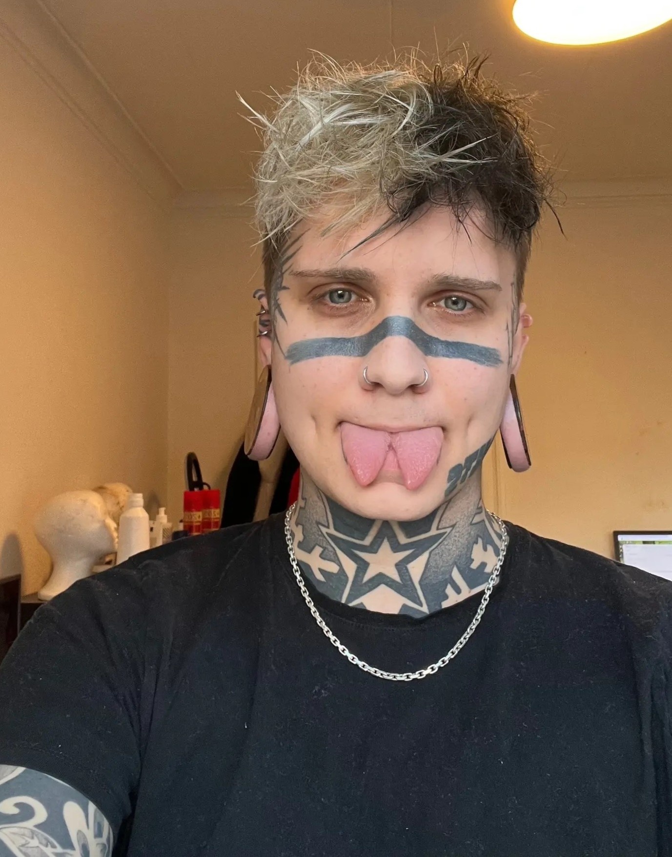 “Lần chỉnh sửa yêu thích nhất của tôi là nong tai. Sụn và dái tai của tôi đã trải qua 6 lần nong rộng ra vì trông nó thật nhàm chán. Tôi muốn tạo hình cho chúng tàn bạo hơn. Vì vậy, thay vì tỉa tai yêu tinh, tôi đã loại bỏ các bộ phận”, anh giải thích.