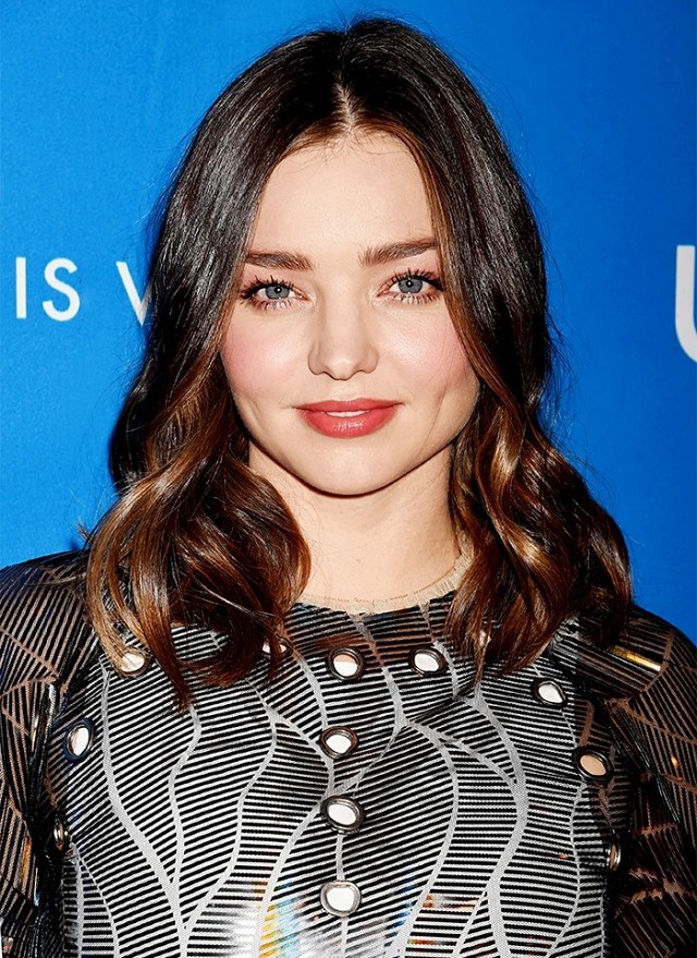 Miranda Kerr chọn mái dài uốn nhẹ nhằm che bớt phần má bầu bĩnh. |