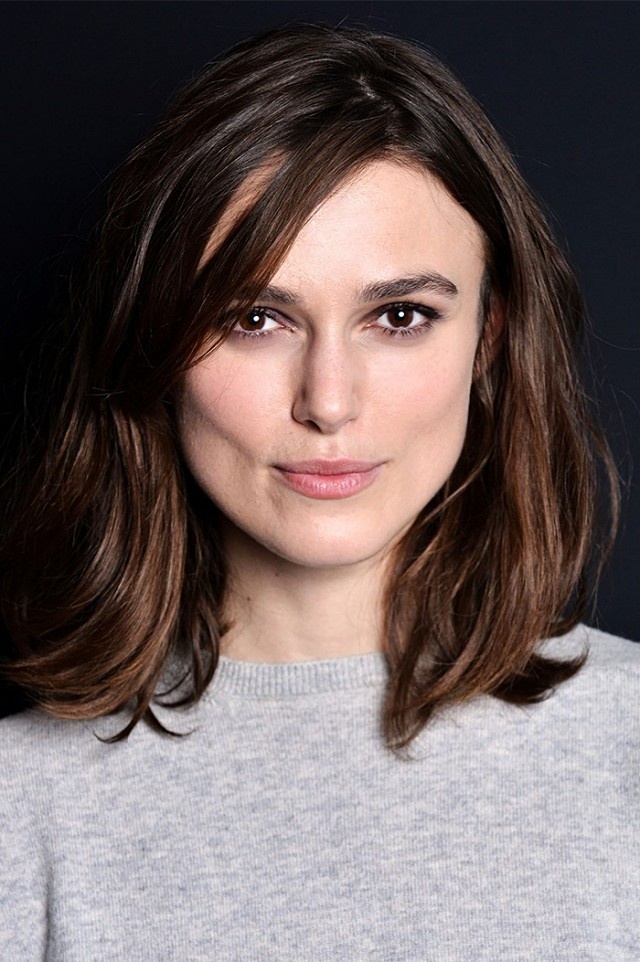 Keira Knightley với mái tóc lob uốn lọn mềm mại và mái xéo giúp che phần trán lớn. |