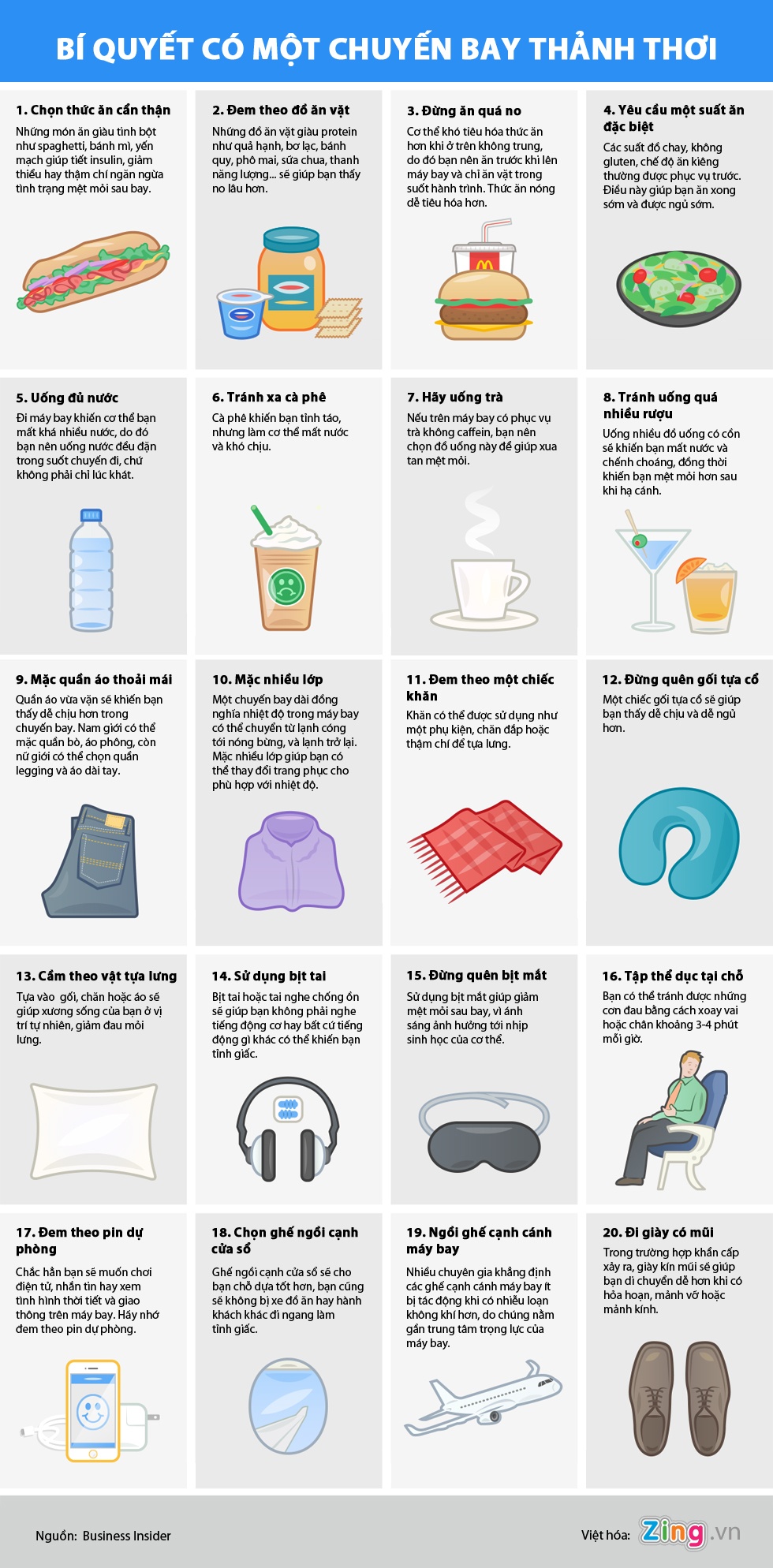 Du khách nên chọn thức ăn cẩn thận, uống đủ nước, mặc quần áo thoải mái... để giảm mệt mỏi sau những chuyến bay dài.