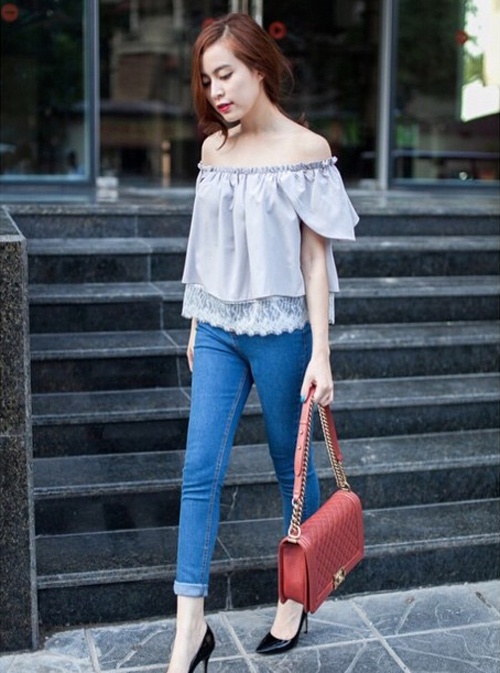 | 1. Mix kèm quần skinny jeans: Kiểu áo trễ vai có thiết kế thoải mái của Hoàng Thùy Linh khi kết hợp cùng quần ôm sẽ tạo phong cách đối lập, giúp bạn tôn thêm vẻ thanh thoát cho cơ thể. |