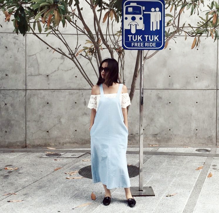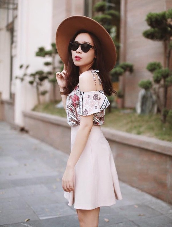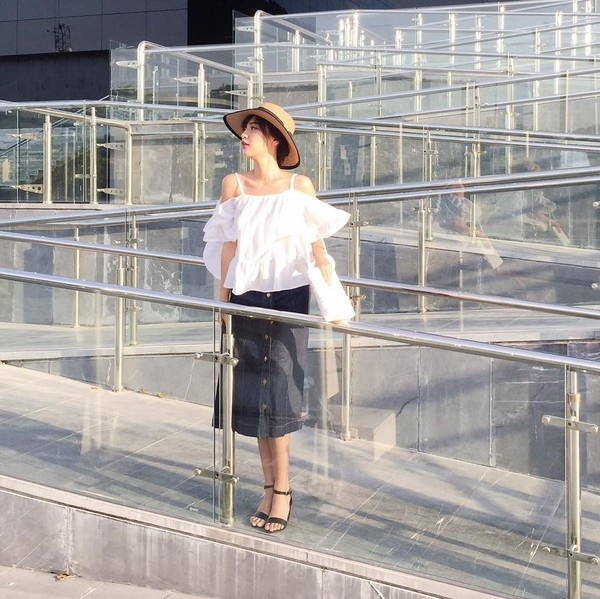 | 9. Mix kèm váy cài cúc: Mốt váy cài cúc của hè năm nay được Thu Thảo kết hợp cùng áo trễ vai chất liệu denim trẻ trung. |