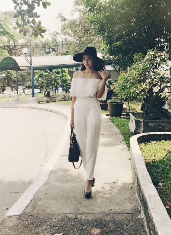 | 3. Mix kèm quần Âu: Với những cô gái nữ tính như Emily thì chọn áo trễ vai mix kèm quần âu đơn giản cùng tông màu sẽ tôn thêm vẻ thanh lịch. |