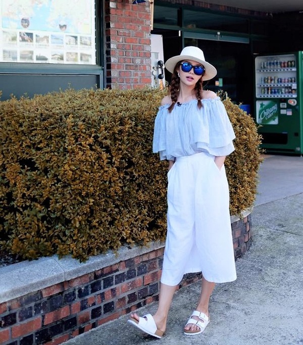 | 4. Mix kèm quần culottes: Thời trang dạo phố của Minh Hằng rất được khen ngợi với áo trễ vai, quần lửng và dép bệt. |