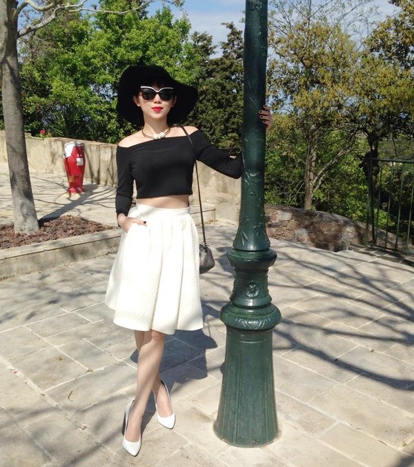 | 7. Mix kèm váy xòe: Tóc Tiên khoe vẻ đẹp hiện đại và không kém phần quyến rũ với mốt áo trễ vai và váy xòe có tông màu đối lập. |