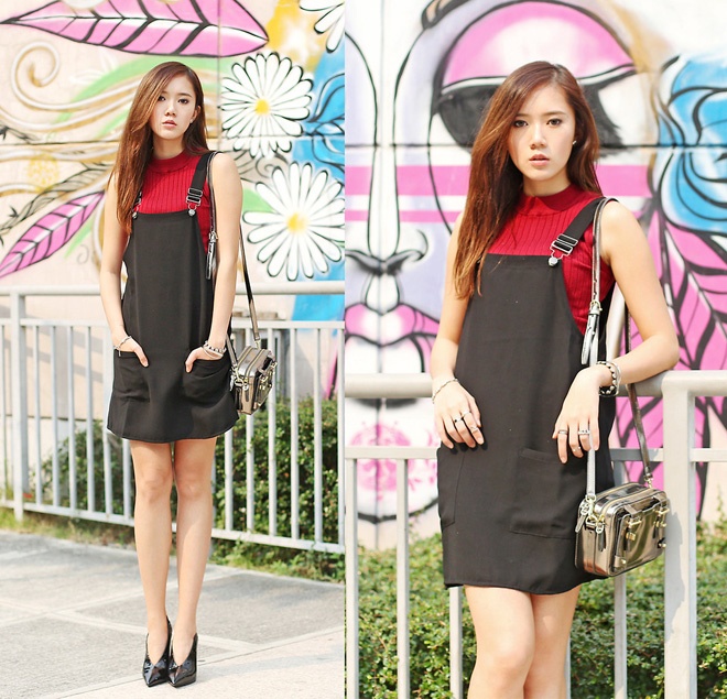 | Một gợi ý phối layer dành cho ngày thu nhiệt đới. Váy yếm kèm áo len sát cánh mang lại vẻ tươi tắn, năng động cho cô nàng thành thị. |