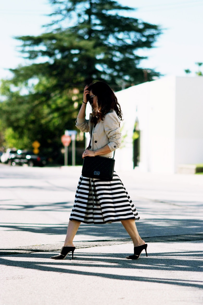 Giày mules đầy cá tính khi xuống phố với váy midi kẻ ngang.