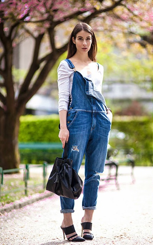 Tăng độ trẻ trung cho giày mules với quần yếm denim.