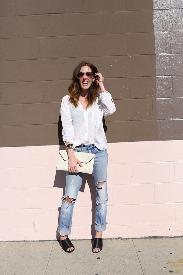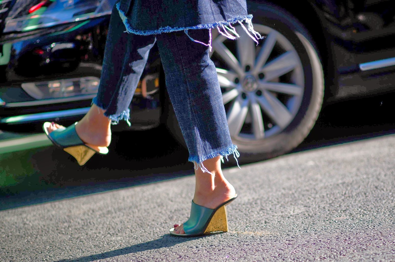Giày mules trẻ trung trên phố với quần jeans xé gấu.