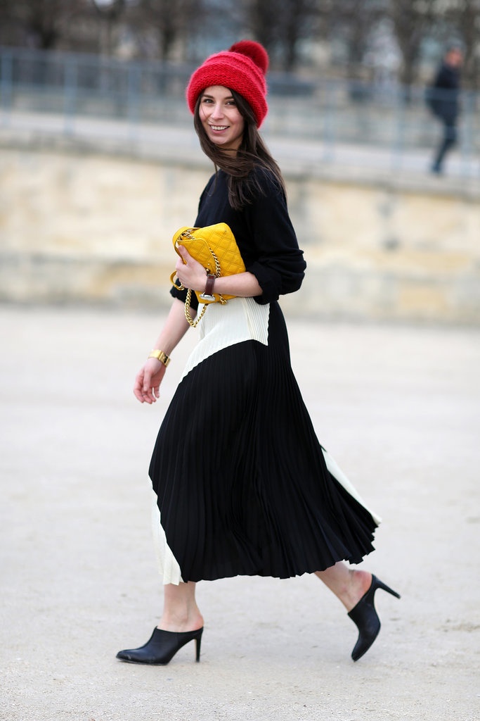 Váy midi chất liệu mềm mại giúp tăng vẻ quyến rũ cho đôi giày mules.