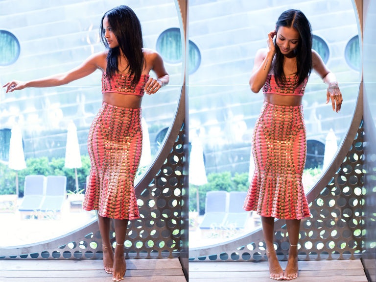 Với áo crop top, Karrueche có thể thoải mái mặc váy midi, maxi mà không mang cảm giác ngắn người.