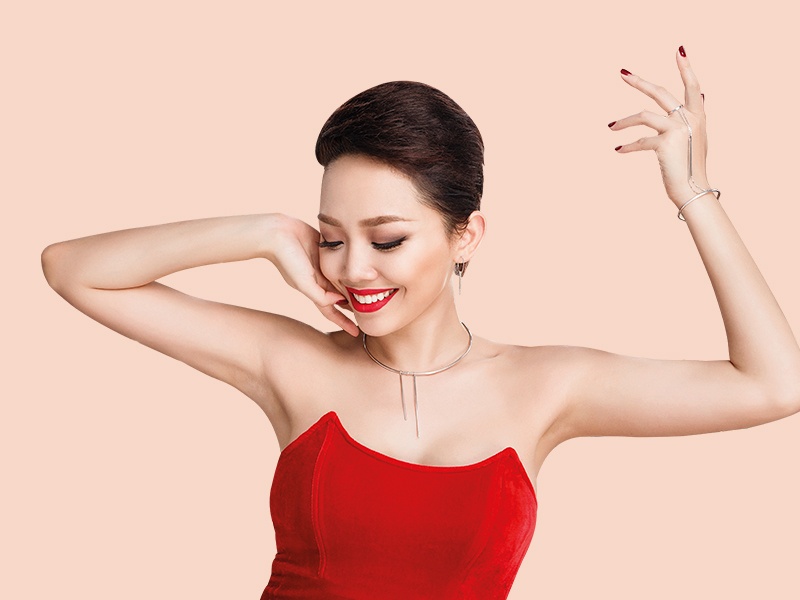 | Bộ cánh với sắc đỏ rực rỡ đi cùng những đường xếp ly tinh tế là sự lựa chọn hoàn hảo để Tóc Tiên nổi bật trong mọi khoảnh khắc. Mix cùng trang sức có thiết kế đối xứng đặc trưng mang chủ đề SHE cân bằng, Tóc Tiên như một quý cô thời thượng. Là một trong những item được giới trẻ yêu thích, bộ trang sức SHE cân bằng đại diện cho cô gái đầy bản lĩnh, biết dung hòa giữa yếu mềm và mạnh mẽ. |