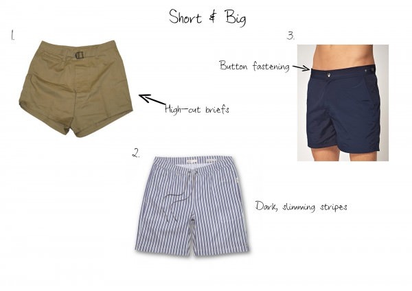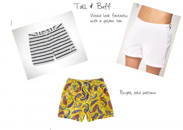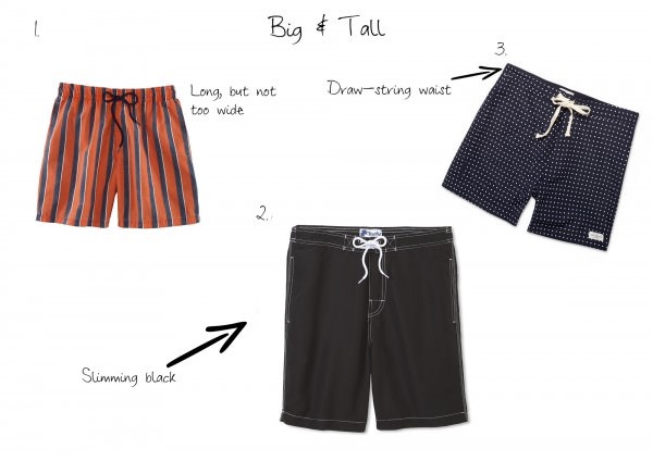 | Nếu có dáng cao và đậm người, bạn nên chọn quần đùi dáng dài, màu tối, rộng rãi thoải mái. Nếu vùng đùi không được săn chắc thì bạn nên tránh quần bơi túi hộp. Sọc dọc hoặc họa tiết nhí sẽ che đi khuyết điểm ngoại hình của bạn. Tránh quần dáng trunk, Speedo brief và thong. |