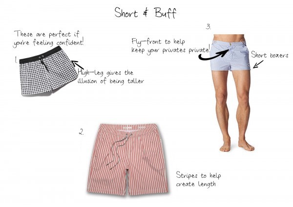| Dáng quần bơi phù hợp với nam giới thấp và cơ bắp là quần đùi trunk hay boxer. Quần nên ngắn hơn 15cm để kéo dài thêm đôi chân của bạn. Tránh quần đùi rộng vì chúng làm bạn trông càng thấp. Ưu tiên chọn họa tiết kẻ sọc dọc để tạo hiếu ứng ăn gian chiều cao. |