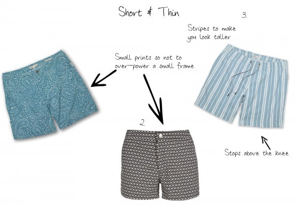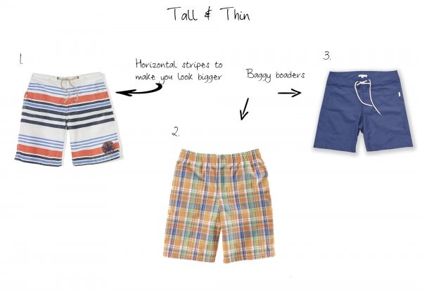 | Các loại quần bơi phù hợp với nam giới thấp và gầy là quần dáng trunk hoặc quần đùi ngắn ống đứng. Tránh chọn họa tiết to bản vì chúng gây cảm giác bạn lọt thỏm trong đồ bơi. Chọn họa tiết nhí, sọc kẻ tương đồng. |