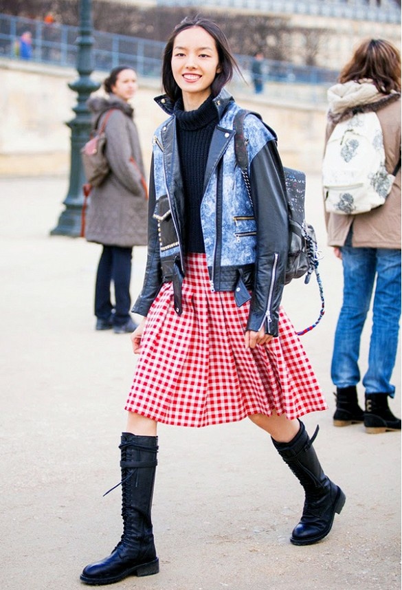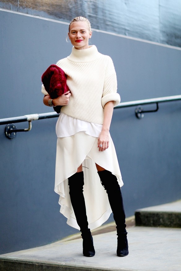 | Mẫu váy high low mỏng manh vẫn phát huy vẻ đẹp trong ngày lạnh với bốt cao cổ và áo len lửng. |