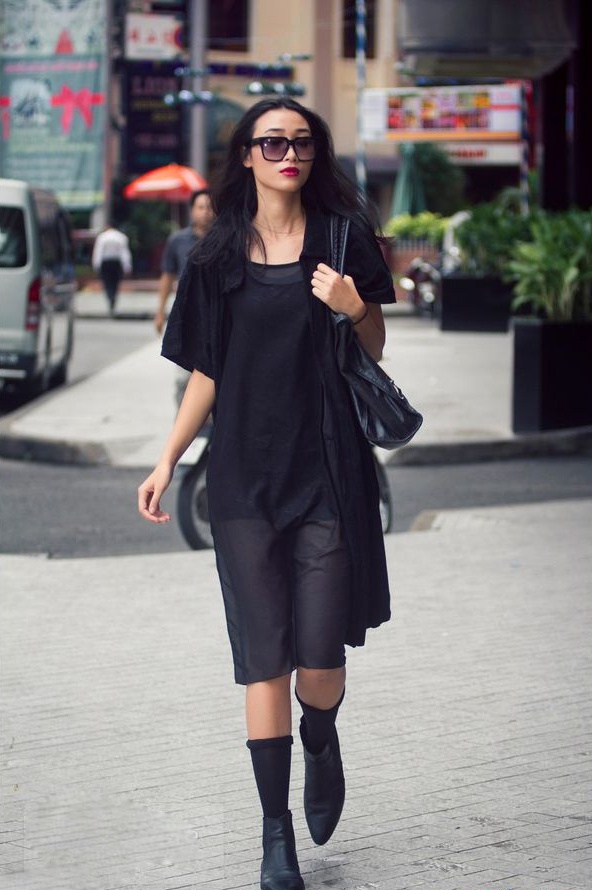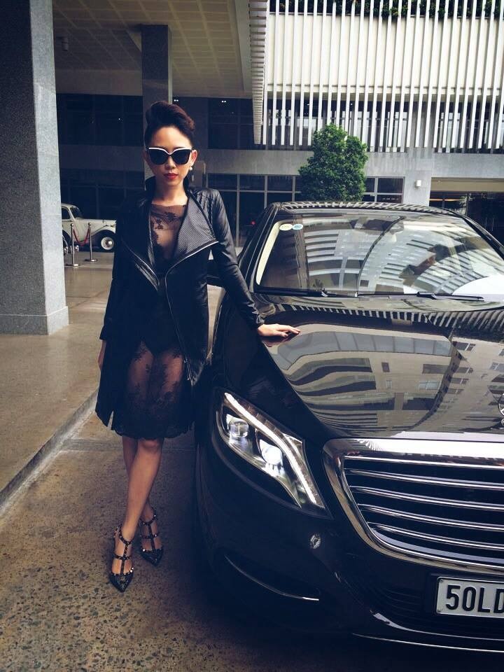 | Mốt váy trong suốt được Tóc Tiên "nâng cấp" sang ngày thu với áo khoác da. |