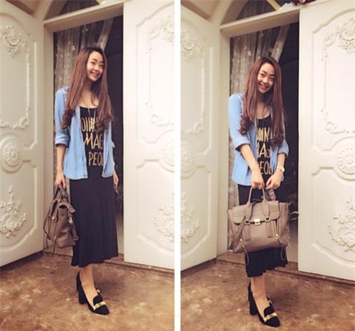 | Minh Hằng diện váy midi với áo sơ mi denim khỏe khoắn. |