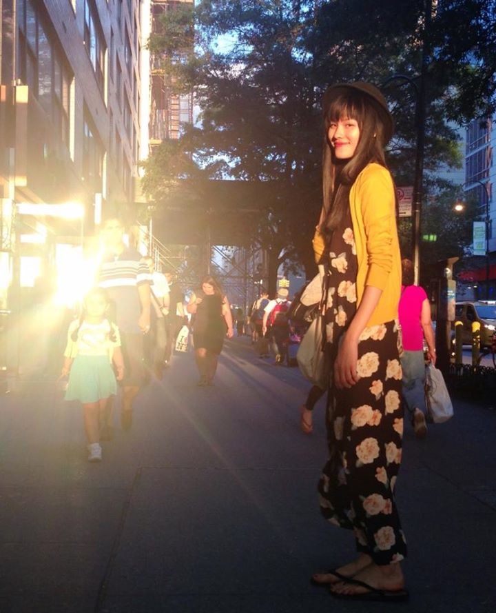 | Hình ảnh xinh xắn của Tuyết Lan trên phố với maxi hoa và cardigan. |