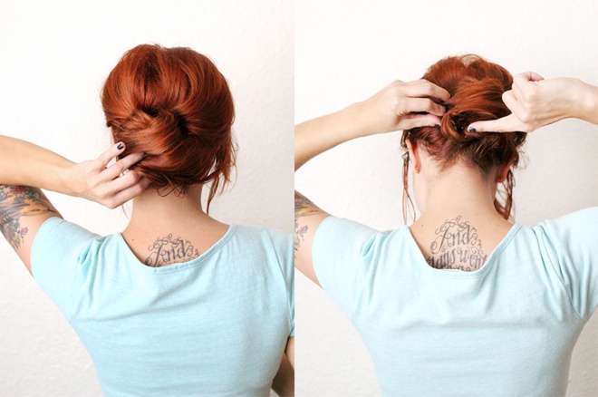 | Bước 4. Dùng 1 tay giữ phần đuôi tóc, tay còn loại xoắn tóc vào trong thành búi nhỏ. |
