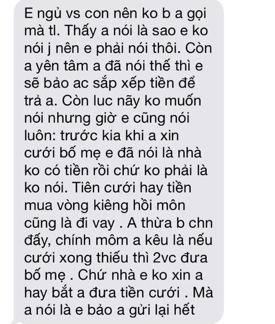 | Vợ B.T cũng thừa nhận khi cưới nhau, gia đình cô không có tiền, phải vay tiền mua của hồi môn cho cô. Cô cũng hứa hẹn anh chị mình sẽ sớm trả lại tiền đã vay của B.T. |