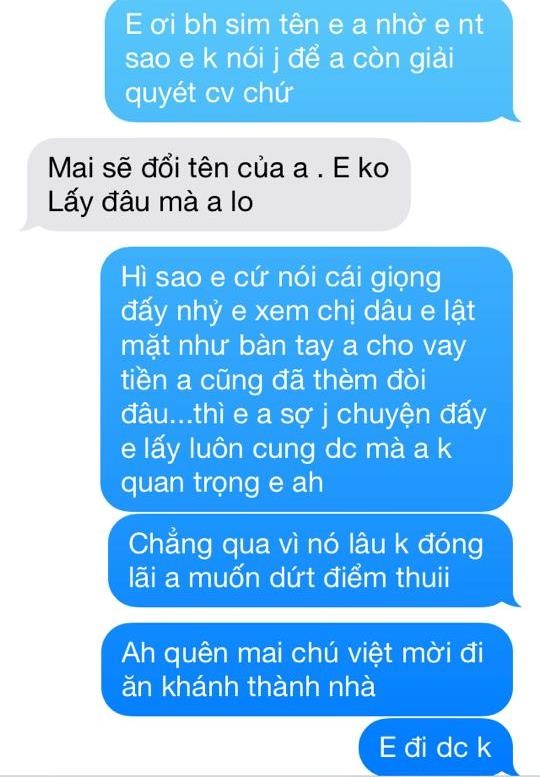 | Tin nhắn B.T giục vợ trả sim cho khách hàng. |