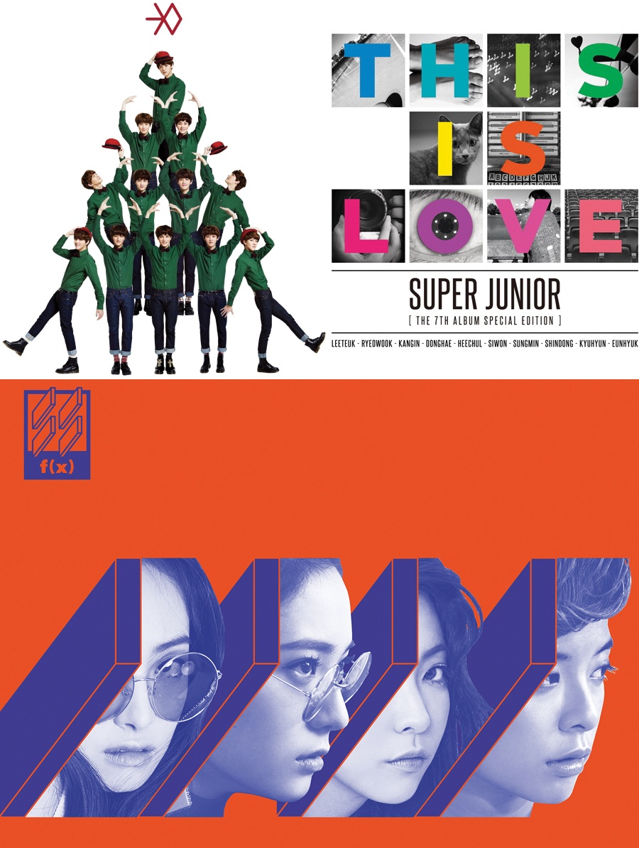 | 3 bìa đĩa được giải thiết kế của nhà SM (trên xuống, trái sang): EXO, Super Junior và f(x). Ảnh: SM Entertainment |
