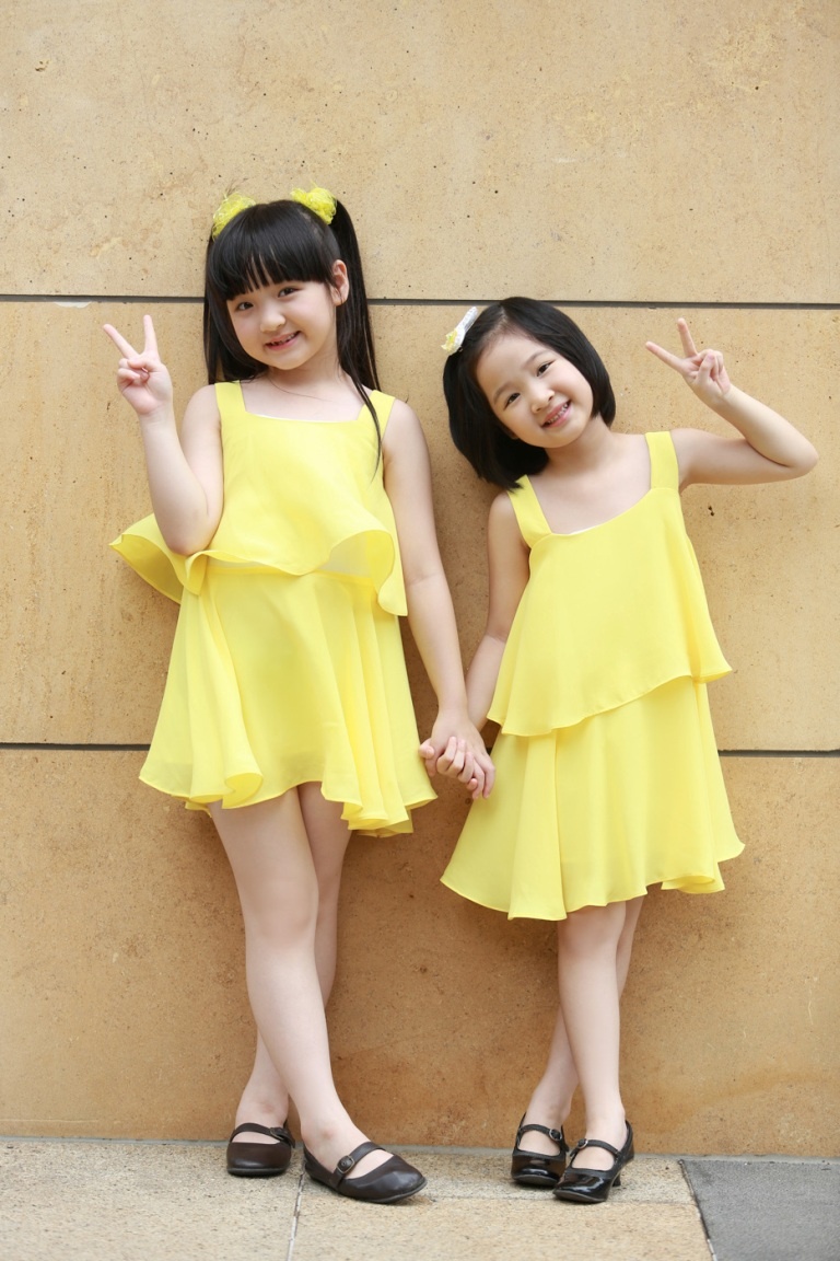 | Bích Ngọc và em gái Phương Trang cùng diện trang phục sắc vàng đồng điệu. Nhóc tỳ 4 tuổi không kém cạnh chị gái về diễn xuất cũng như tạo dáng trước ống kính. |