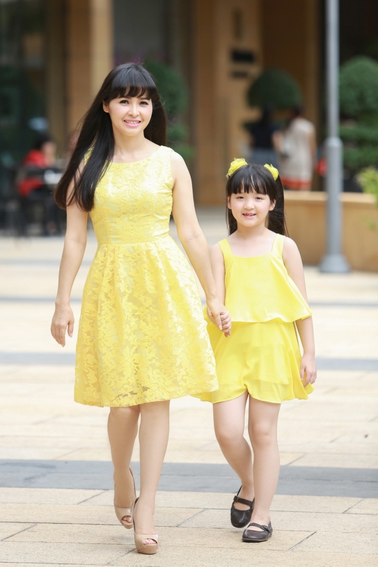 | Giọng ca dòng nhạc quê hương diện trang phục váy họa tiết hoa nữ tính, đồng màu cùng con gái cưng. |
