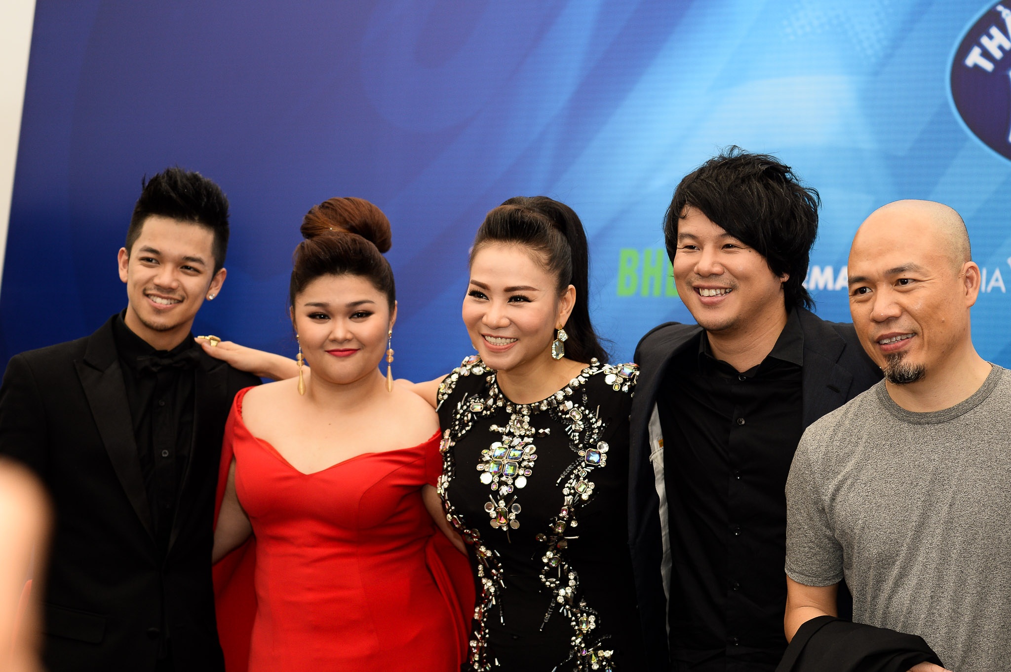 "Khủng long nhí" chụp ảnh cùng Trọng Hiếu, Thanh Bùi, Thu Minh và giám đốc âm nhạc Huy Tuấn. |