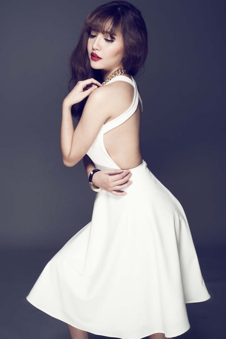 | Trang phục tông màu trắng đen mix ăn ý với dáng váy xòe nữ tính, nhẹ nhàng. Dù không phải là người mẫu chuyên nghiệp, Bùi Bích Phương thể hiện khá ấn tượng nhờ thần thái sinh động và đầy cảm xúc. Bộ ảnh được thực hiện bởi stylist Đỗ Long, trang điểm Quân Nguyễn, nhiếp ảnh Milor Trần và trang phục Nick Dragon. |