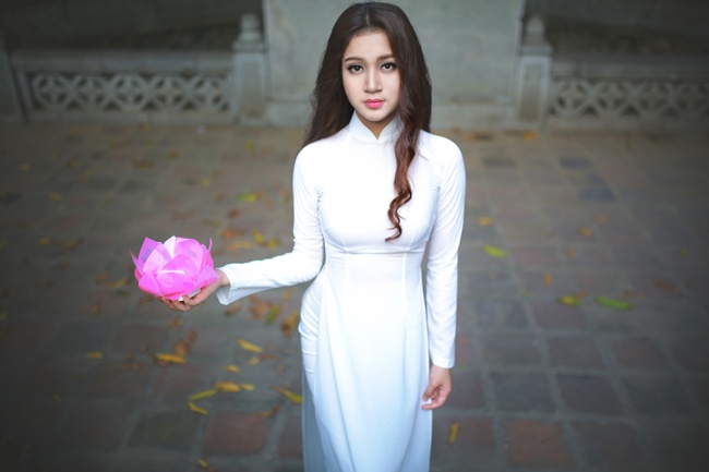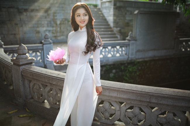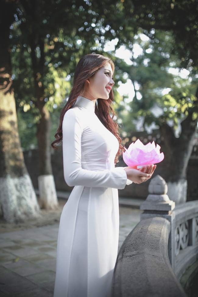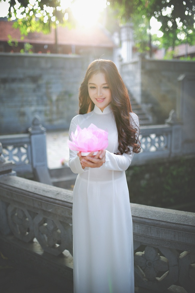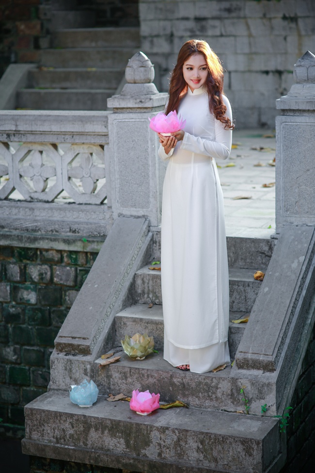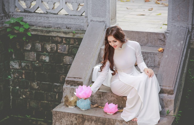 | Nhân ngày lễ Vu lan, Nguyễn Phạm Bích Trâm thực hiện bộ ảnh với tà áo dài tại ngôi chùa cổ kính. |