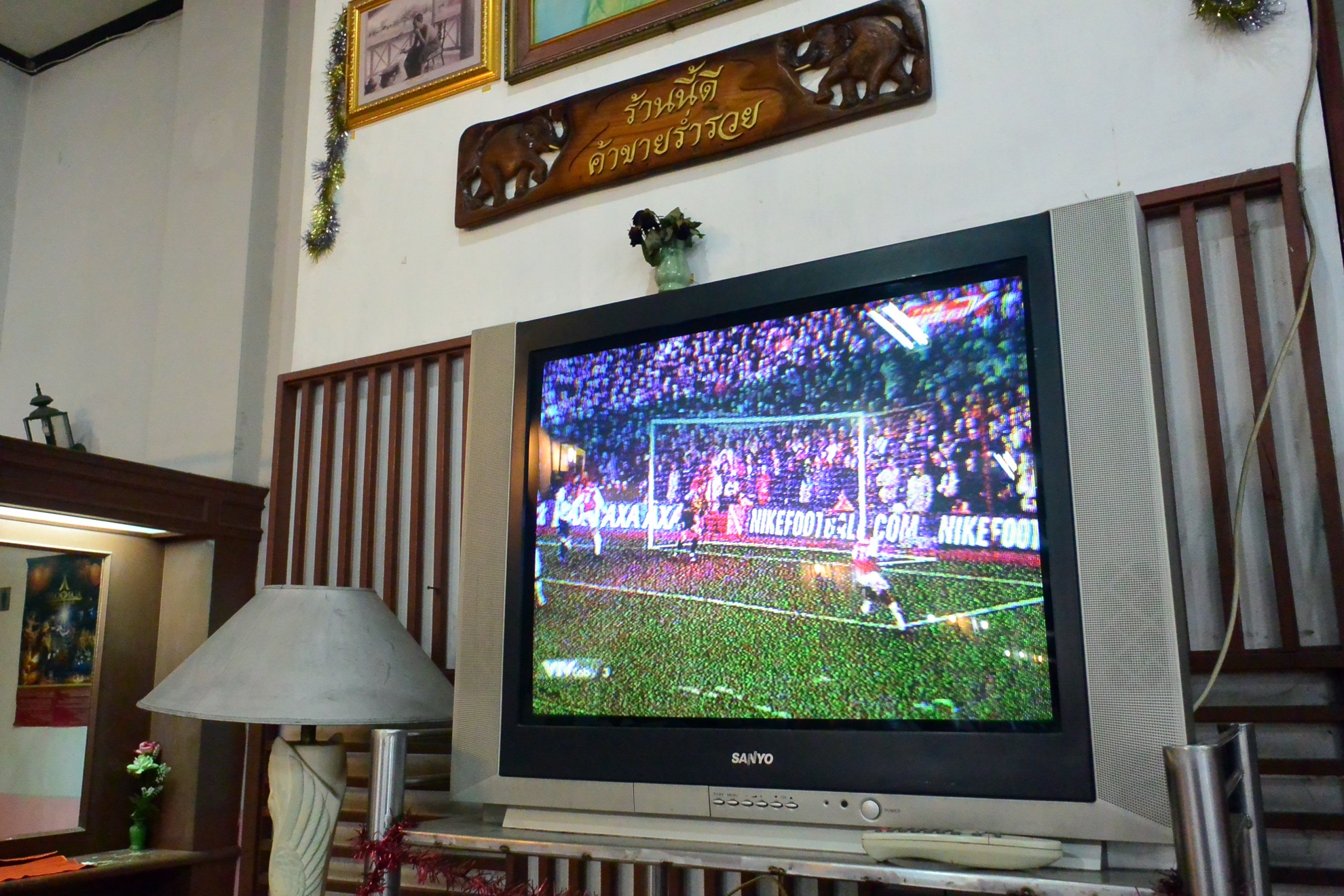 | Tại một nhà hàng bình dân, tivi phát kênh thể thao của Việt Nam để phục vụ khách ngồi ăn uống. |