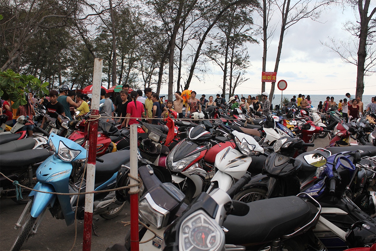 Đến hơn 16h, bãi giữ xe đã quá tải. Không chỉ xe máy, rất nhiều xe du lịch, ô tô con đã phải đậu dọc các tuyến đường và cả trên vỉa hè dọc bãi tắm.