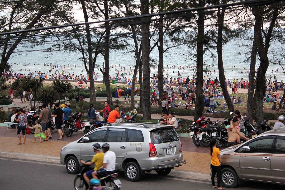 Con đường dài 800 m vắt ngang biển Đồi Dương và các đường lân cận đông nghịt người và xe.