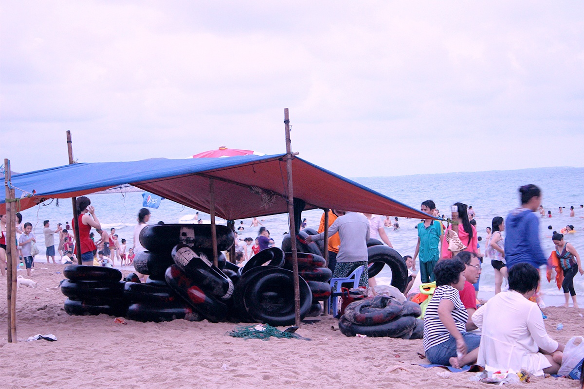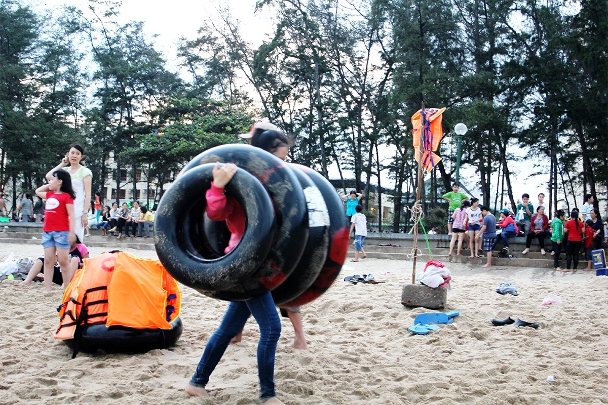 | Hương (16 tuổi) cho biết cả nhà em đã làm nghề cho thuê phao bơi được hơn 10 năm nay. Dịp lễ này, khách đến thuê phao cũng nhiều hơn nên cả nhà chia làm 2 chốt dọc bãi biển. |