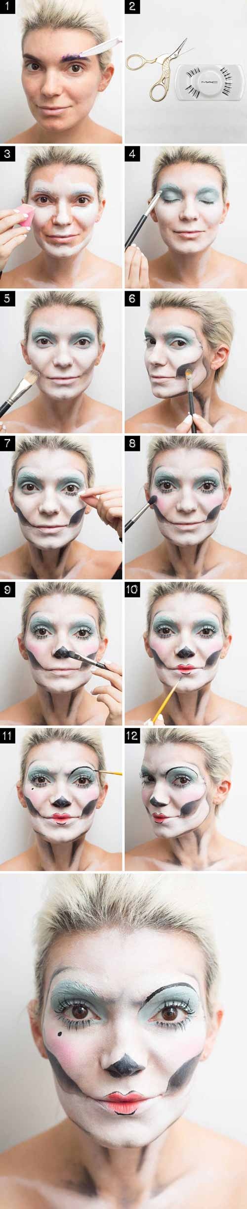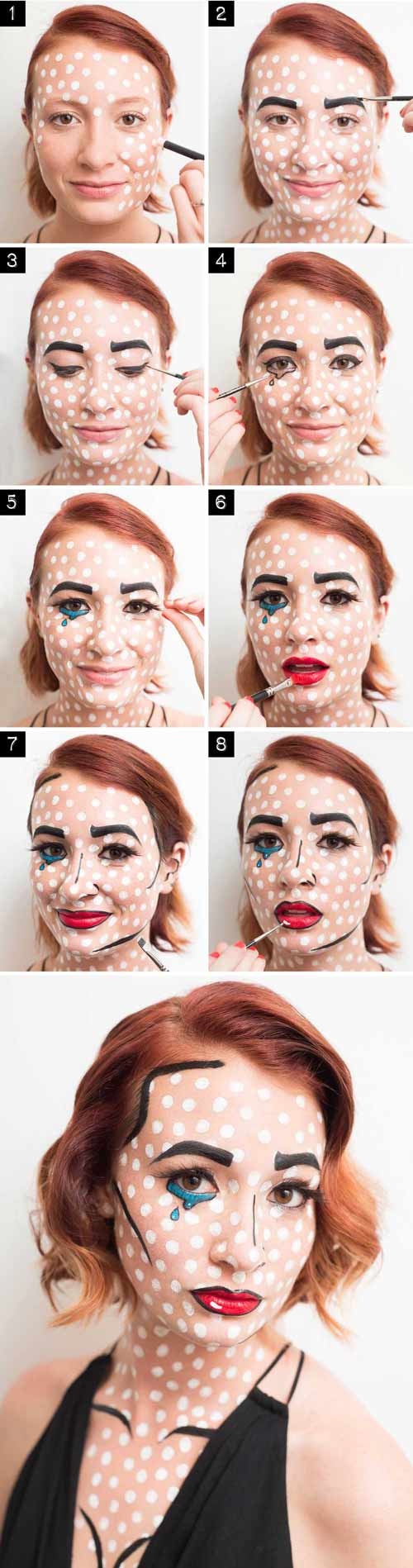 Mọi ánh mắt xung quanh sẽ phải đổ dồn về phía bạn trong đêm Halloween. Đôi lông mày đậm nổi bật trên nền da chấm bi được ngụy trang khéo léo bằng kem trắng, đôi mắt xanh hình nước mắt ấn tượng và độc đáo hơn là môi đỏ được phá cách bằng viền đen và một chấm trắng.