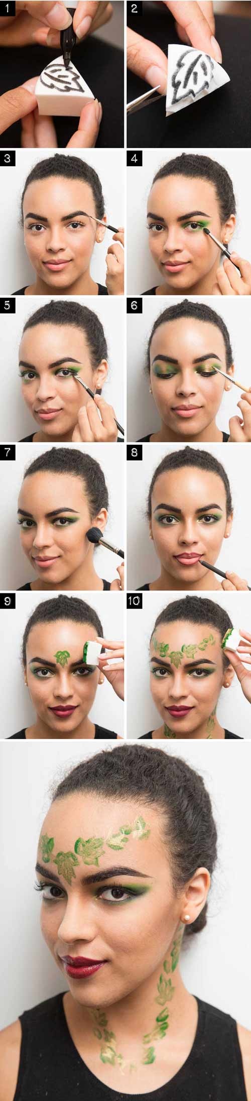 Sau đó hãy cắt phần trên của mút theo tạo hình, chấm mút phấn vào màu vẽ phù hợp với hình bạn chọn và cuối cùng là chấm lên mặt thôi. Bạn hãy kẻ mắt đồng tone với màu họa tiết để tôn thêm vẻ huyền bí nhé!