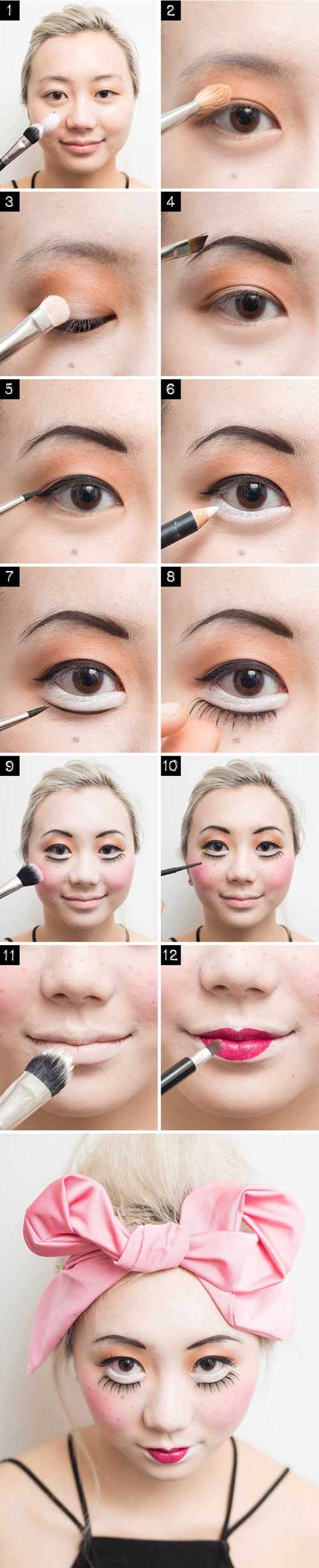 Điểm nhấn của tạo hình này chính là đôi mắt. Bạn hãy đánh thật trắng mặt bằng phấn trắng, sau đó chọn màu phấn mắt tone cam hoặc vàng.