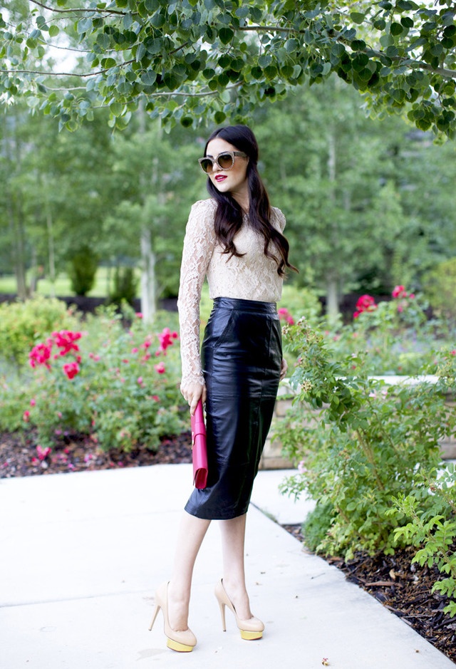 Váy bút chì chất liệu da mix kèm áo ren thích hợp phong cách công sở thanh lịch.
