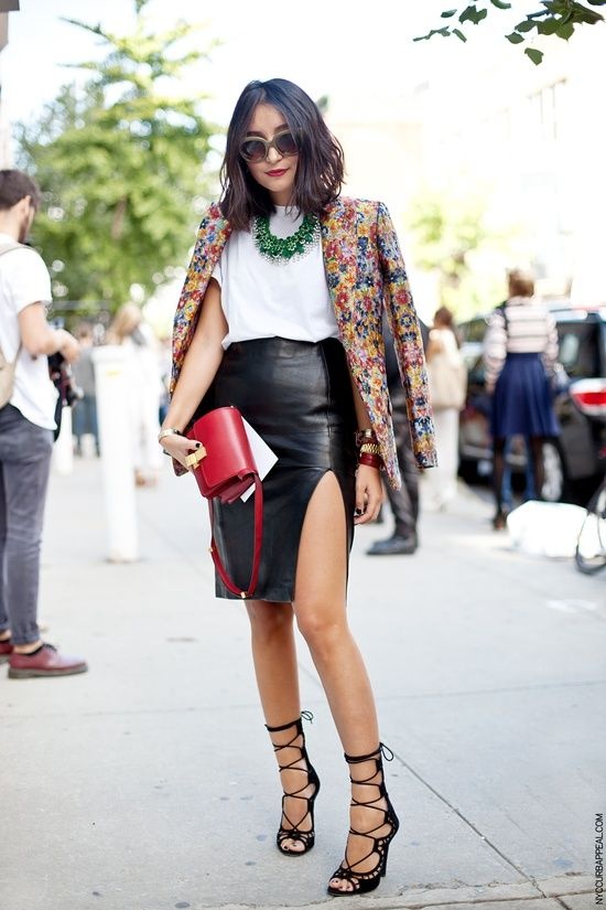 Váy bút chì họa tiết hoa mix kèm sơ mi trắng thích hợp cô nàng nữ tính. Nếu sử dụng trang phục này đi dự tiệc, bạn có thể tạo điểm nhấn với vòng cổ và giày có tông màu nổi.